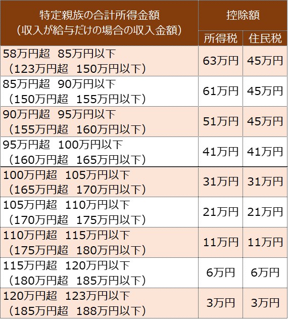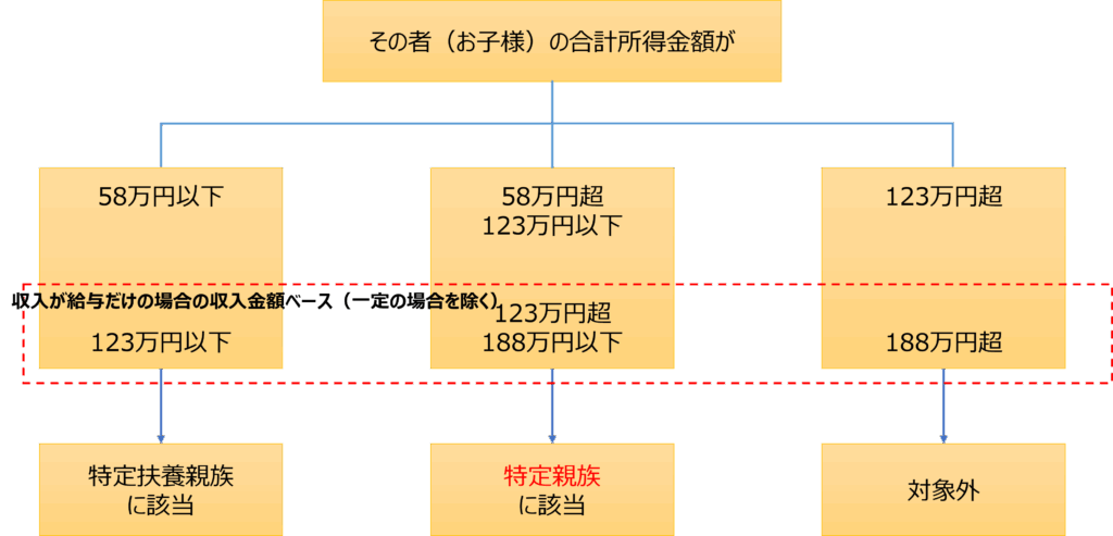 今回の改正により、特定扶養親族の所得要件が10万円引き上げられた他、合計所得金額が58万円を超えても123万円以下であれば、今回新設された「特定親族」に該当します。
