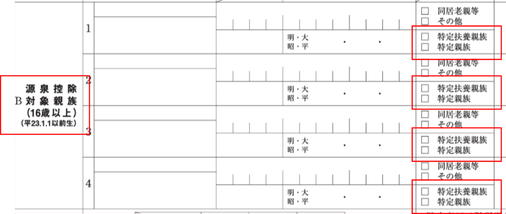 ややこしいのが、ここでは「源泉控除対象親族」のうち、「特定扶養親族」「特定親族」に該当する場合、チェックをつけます。